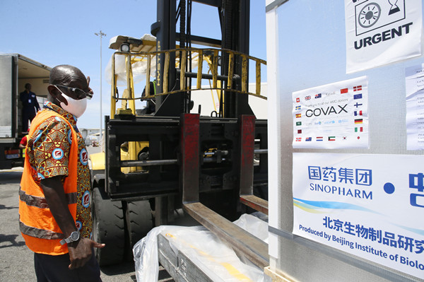 2021年9月18日,工作人员在科特迪瓦阿比让国际机场转运中国国药集团供应的新冠疫苗。新华社发(伊万·宋摄)