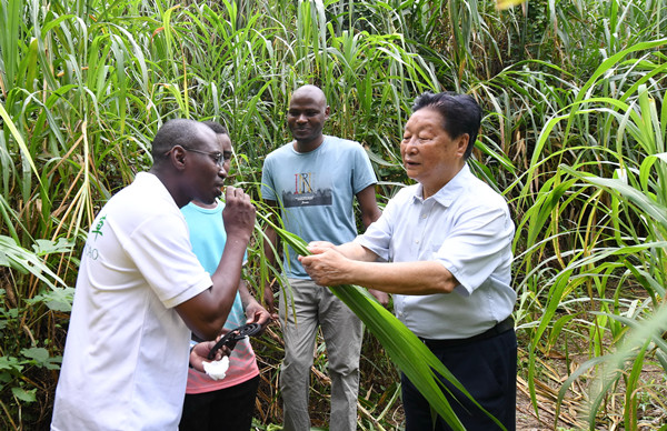 中国福建农林大学国家菌草工程技术研究中心首席科学家林占熺(右一)让尼日利亚留学生试尝幼嫩菌草的味道 新华社记者 林善传摄