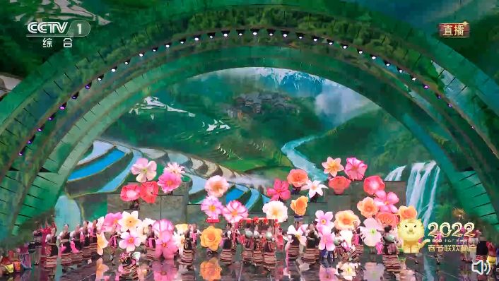 歌舞表演《摆出一个春天》中,舞蹈演员通过鲜活生动的表演,展现了少数民族贫困地区在兄弟省份帮助下,摆脱贫困,追求共同富裕的欢快场景。