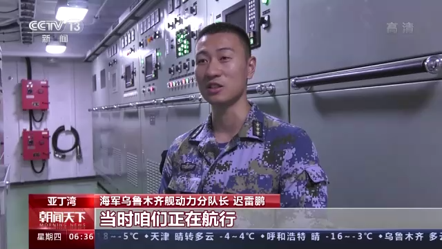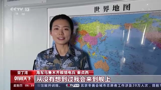 驾驶室里,秦贞西正在自己的岗位上忙碌着。秦贞西来自乌鲁木齐市,这是她第一次执行护航任务,也是在海上过的第一个春节。秦贞西用手在世界地图上比画,从乌鲁木齐市到亚丁湾,直线距离5500多公里,时差3小时。