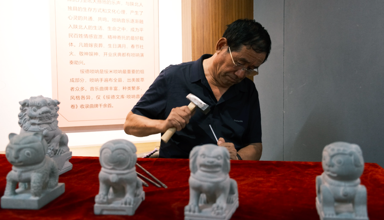 非遗陈列馆“绥德石雕”板块,鲍武文在聚精会神地雕刻着石狮子。人民网记者 吴超 摄