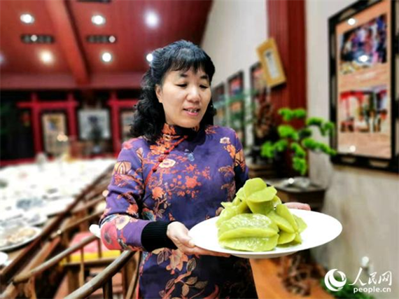 寿山石雕刻家叶秦展示自己创作的“满汉全席”。人民网 林晓丽摄