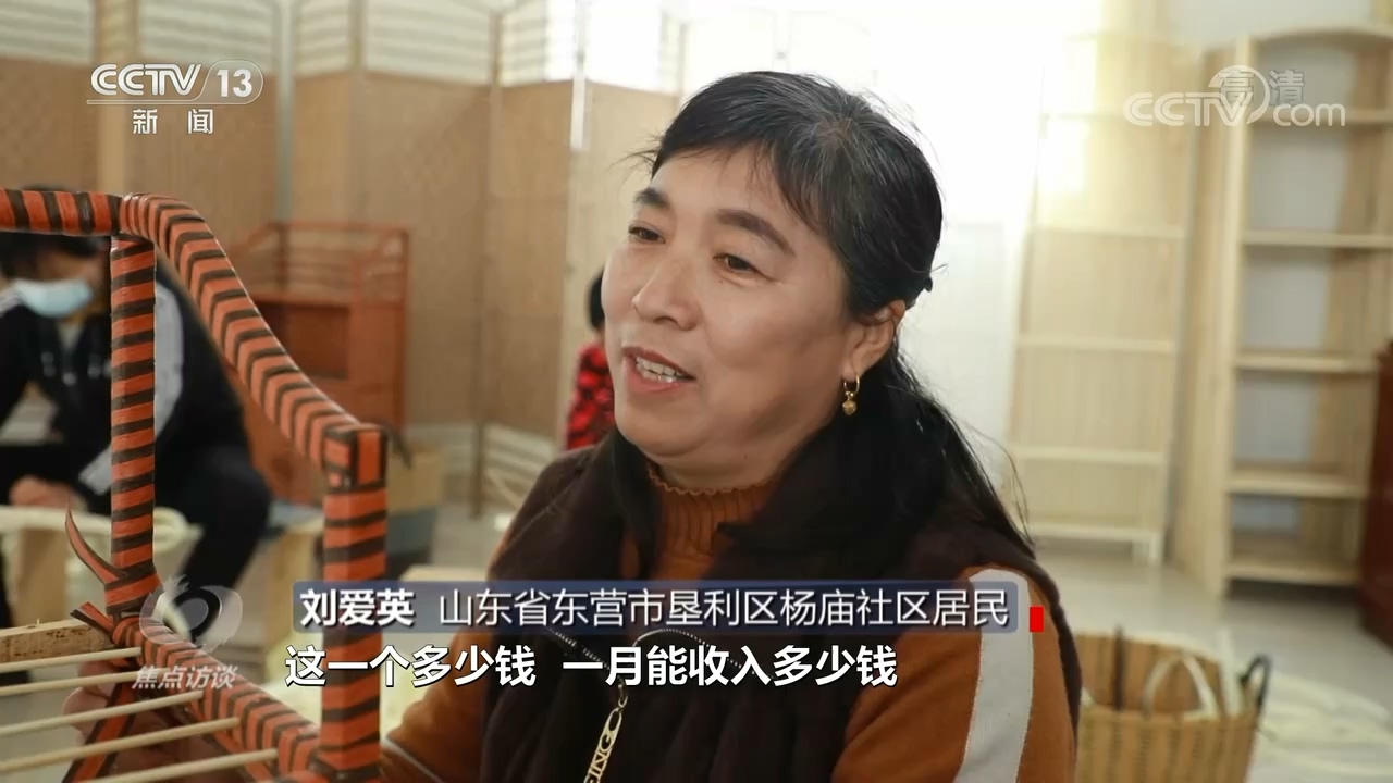 山东省东营市垦利区杨庙社区居民刘爱英说:“总书记进来我们很激动,他说你们编这个东西编多长时间了,我说将近三年了。这一个多少钱?一月能收入多少钱?我说一个月能收入一千五百左右,夏天这里有风扇,冬天有地暖,在家门口能挣上钱,哪儿有这好事。”
