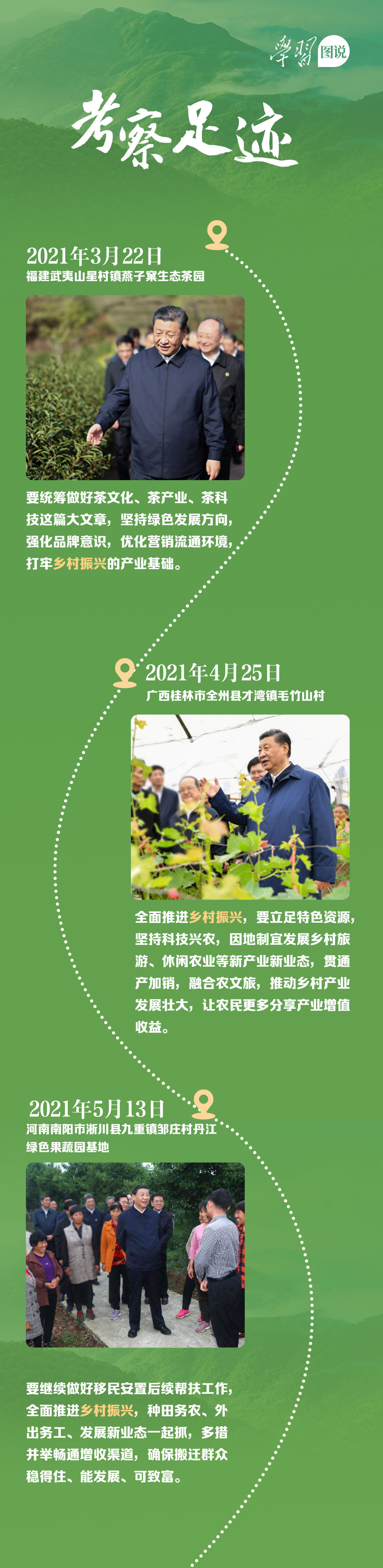 一年来,习近平总书记心系乡村振兴,翻山越岭、跋山涉水,问农民收成、看农村变化、谋农业发展,坚实足迹印在祖国大地上,深切关怀留在百姓心间。