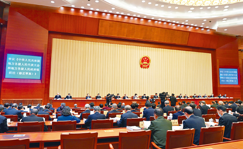 地方各级人民代表大会和地方各级人民政府组织法是关于地方人大、地方政府的组织和工作制度的基本法律。修改这部法律,是新时代坚持党的全面领导、保证党领导人民依法有效治理国家的必然要求,是不断发展全过程人民民主、保证人民当家作主的重大举措。图为2021年12月20日,地方各级人民代表大会和地方各级人民政府组织法修正草案二审稿提请十三届全国人大常委会第三十二次会议审议。 《中国人大》杂志社供图 马增科/摄