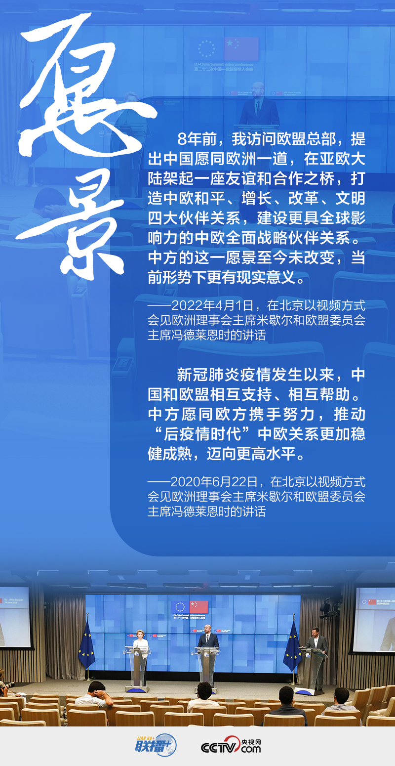 2022年4月1日,习主席在时隔近两年后的这次中欧高峰会晤中,重申中欧四大伙伴关系和中欧全面战略伙伴关系,并鲜明强调,中方的这一愿景至今未改变,当前形势下更有现实意义。