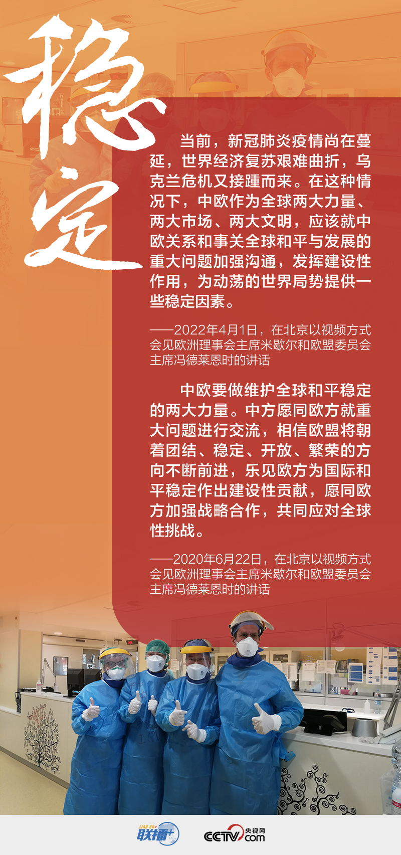 中国和欧盟分别是最大发展中国家和最大发达国家联合体。一个稳定的中欧关系对世界的和平、稳定、发展至关重要。在两次中欧高峰会晤中,习主席都明确表达了中欧作为全球两大力量应对维护全球和平稳定发挥重要作用。