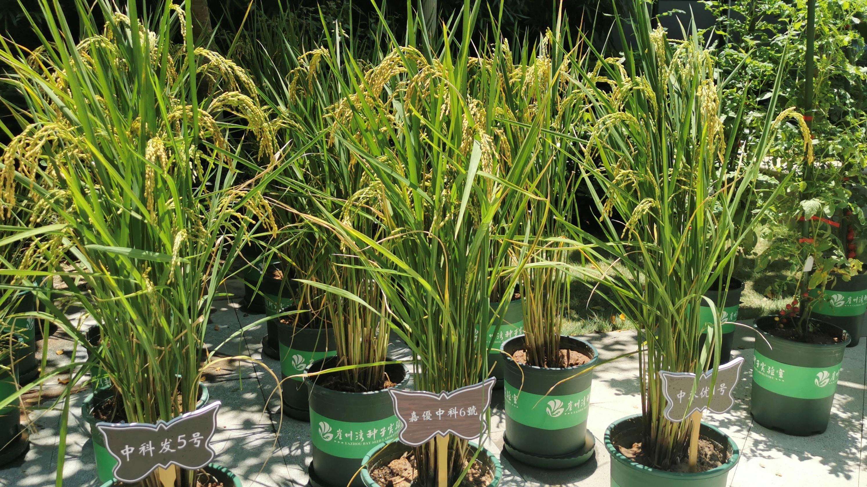 △崖州湾种子实验室展示的水稻品种,包括中科发5号、嘉优中科6号等。(总台央视记者钟锐拍摄)