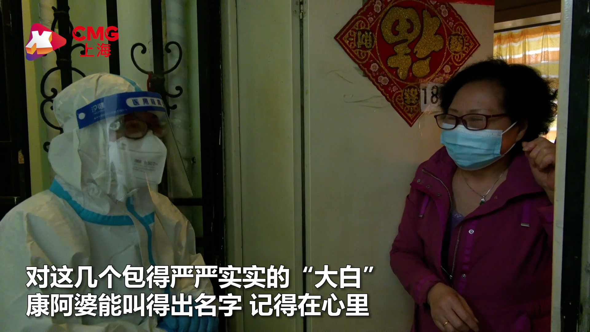 住在四楼的康阿婆已经80多岁了,她是一位独居老人,家人不在身边。陈瑜时不时要过来送蔬菜、问问情况,有时就是来聊聊天。康阿婆对包得严严实实的几个“大白”都能叫得出名字。
