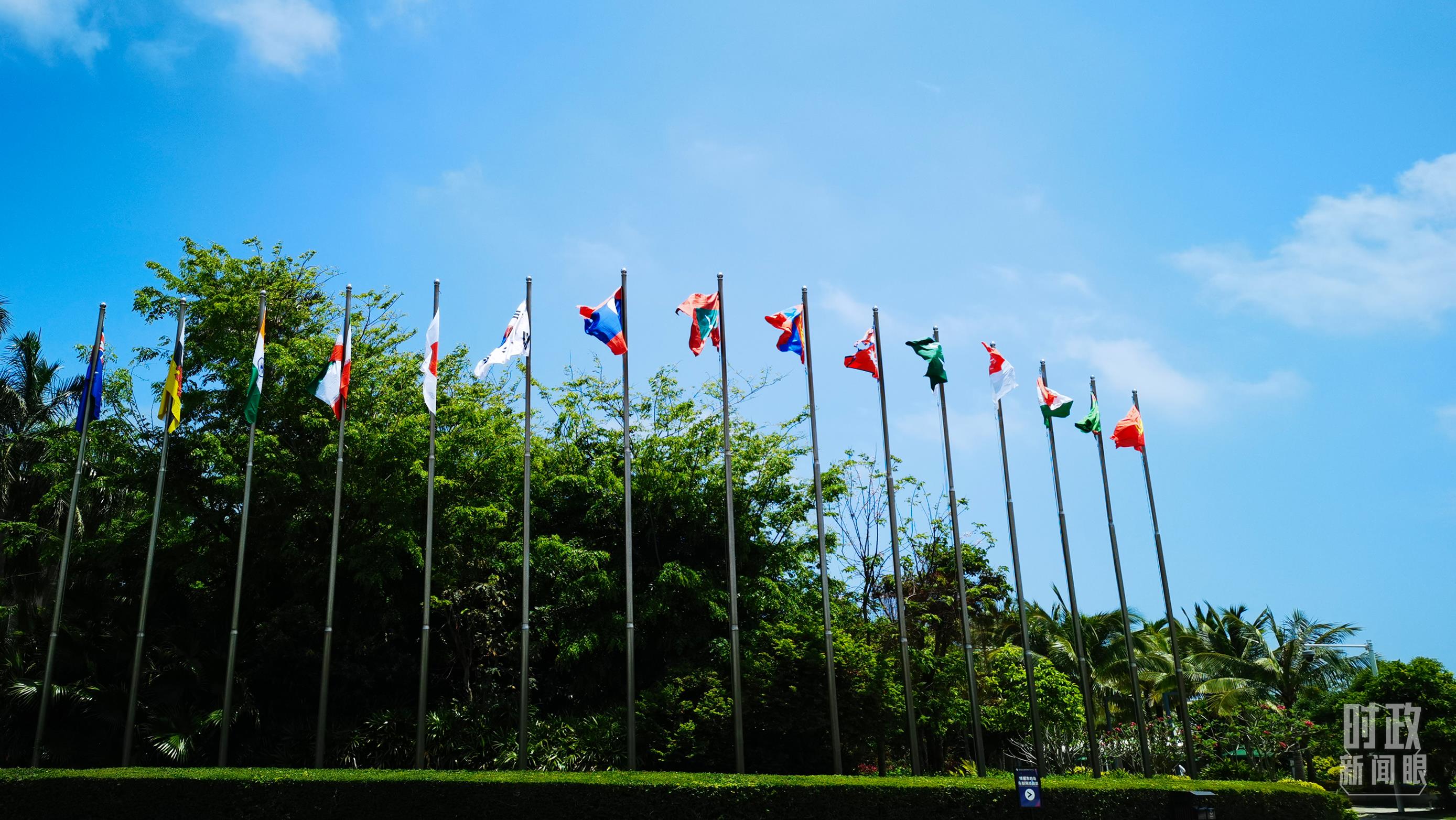 △多国国旗飘扬在博鳌亚洲论坛国际会议中心外。(总台记者许云拍摄)