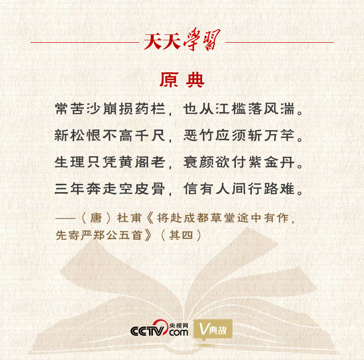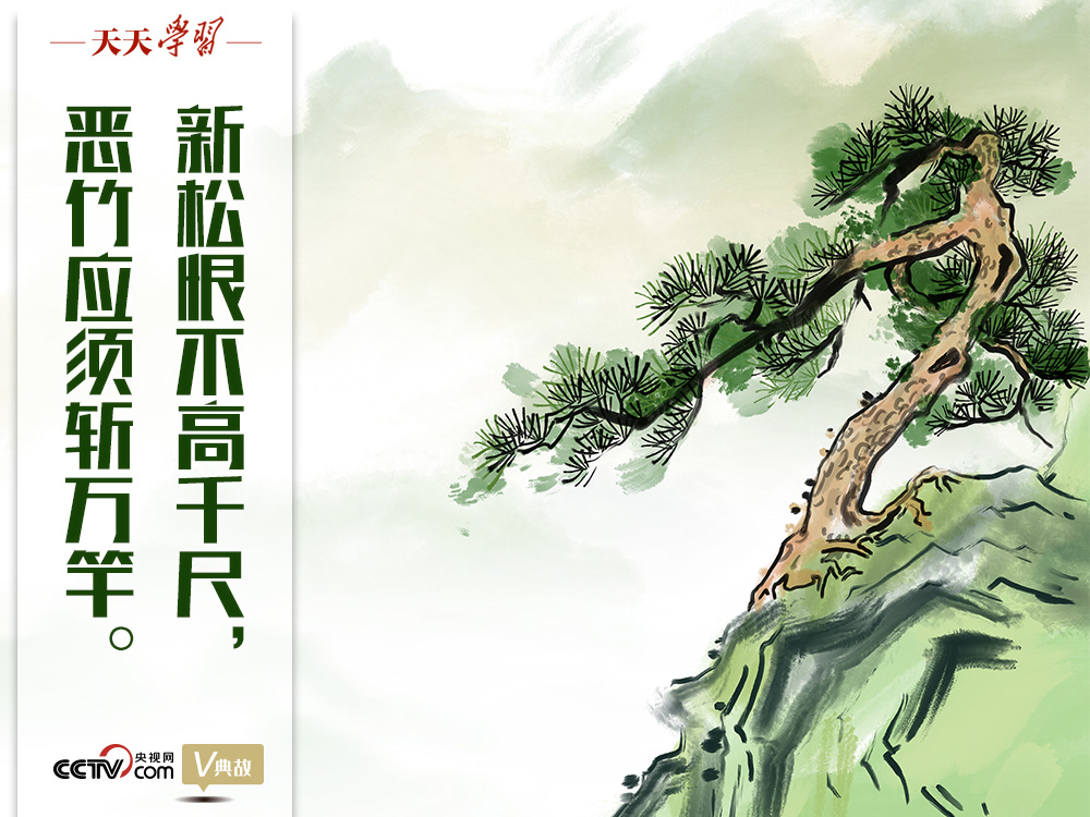 “新松恨不高千尺,恶竹应须斩万竿”为该诗的颔联。“新松”指诗人在成都草堂前培植的四株小松树。诗人在《四松》中这样描述:“四松初移时,大抵三尺强。别来忽三岁,离立如人长。”诗人对这四棵新移植的松树倾注了喜爱之情,恨不得它们迅速长成千尺高树。而对那些随处乱生、妨碍新松生长的“恶竹”,诗人认为纵有万竿也要斩除。