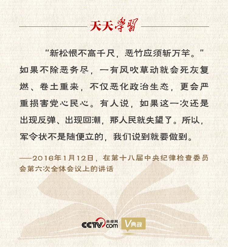 反对腐败、建设廉洁政治,保持党的肌体健康,始终是我们党一贯坚持的鲜明政治立场。党风廉政建设,是广大干部群众始终关注的重大政治问题。2016年,在十八届中央纪委六次全会上,习近平总书记引用杜甫的“新松恨不高千尺,恶竹应须斩万竿”诗句,表明了党中央对党风廉政建设和反腐败斗争的高度重视和坚定决心。他要求持之以恒纠正“四风”,要咬住“常”“长”二字,经常抓、深入抓、持久抓。除恶务尽,决不允许出现反弹、回潮。