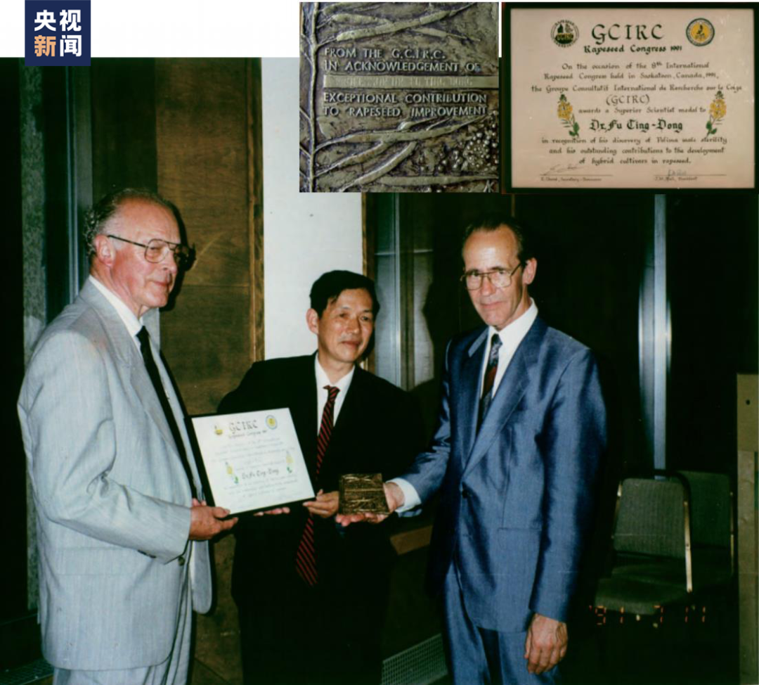 △1991年,傅廷栋(中)获得国际油菜科学界最高荣誉奖-GCIRC杰出科学家奖。