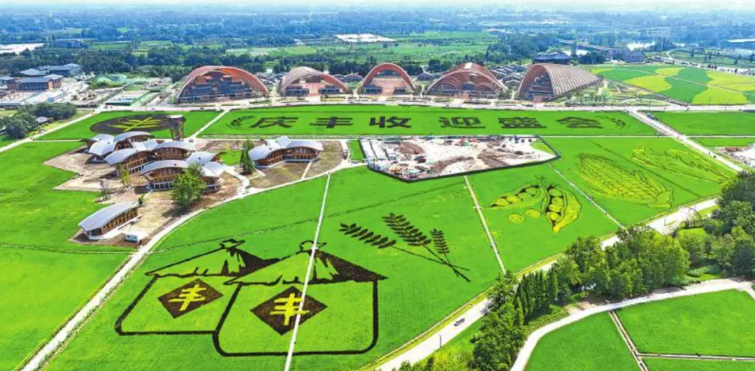 四川成都市新津区的中国天府农业博览园里,稻浪翻滚,以稻田画形式呈现的粮仓、稻穗、玉米等图案格外醒目。