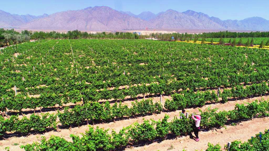 贺兰山下的葡萄种植基地(2022年6月14日摄)