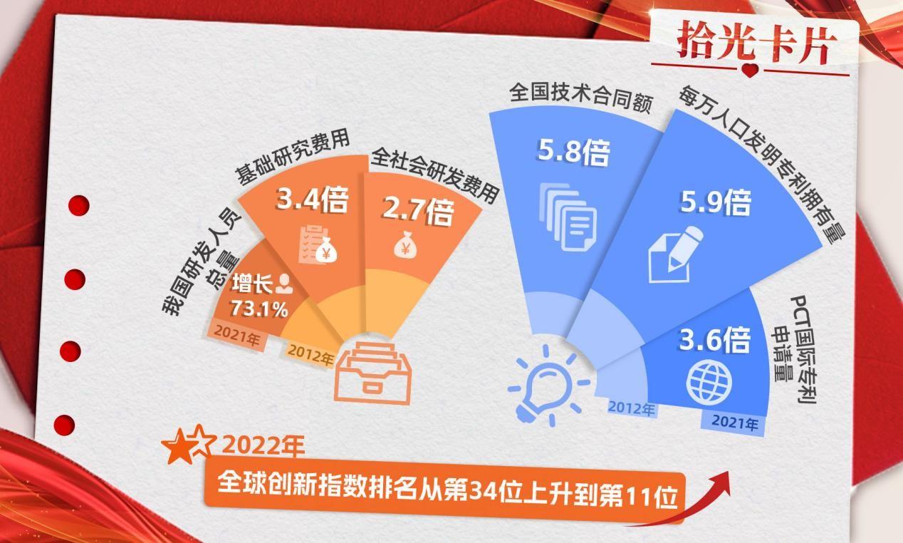 2021年全国技术合同额是2012年的5.8倍,每万人口发明专利拥有量是2012年的5.9倍,PCT国际专利申请量是2012年的3.6倍,连续3年居世界首位。成果转化实现“量质齐升”。