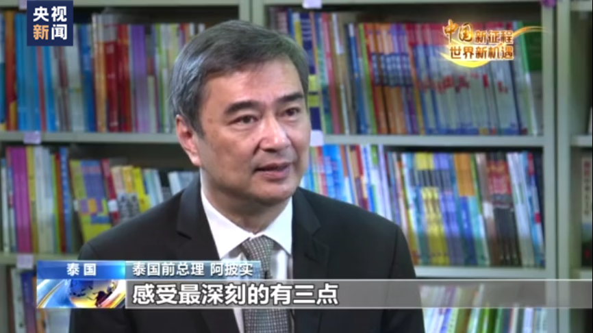 泰国前总理 阿披实:我对习近平主席治国理政理念感受最深刻的有三点,一是以科学为依据制定发展目标,这意味着任何行动都需要有充分的理论支持。二是在决定国家发展方向的时候,坚守初心,无论世界风云如何变化,坚持政治理想,与时俱进,适时做出调整。三是在制定国家发展规划时,坚持人民至上,保障国家治理真正符合人民利益。