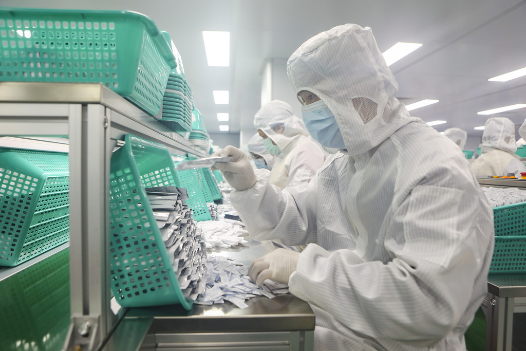 2022年2月21日,深圳某生物科技股份有限公司生产车间现场。工人在流水生产线上分组作业,生产新冠病毒抗原快速检测试剂盒。 人民视觉 图