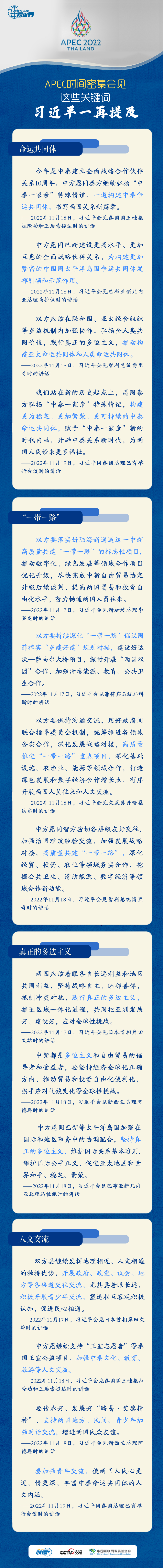 2022年APEC时间,习近平主席在泰国曼谷与多位外国政要会见、交谈,多次提及“命运共同体”“一带一路”“真正的多边主义”等关键词,既阐述了倡议主张,又提出了务实举措。央视网《联播+》特作梳理,与您一起学习。