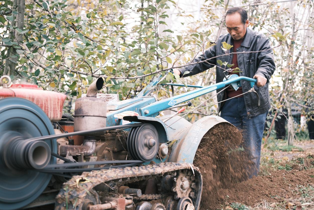村民李育宏在苹果园里用开沟机开沟。人民网记者 吴超摄