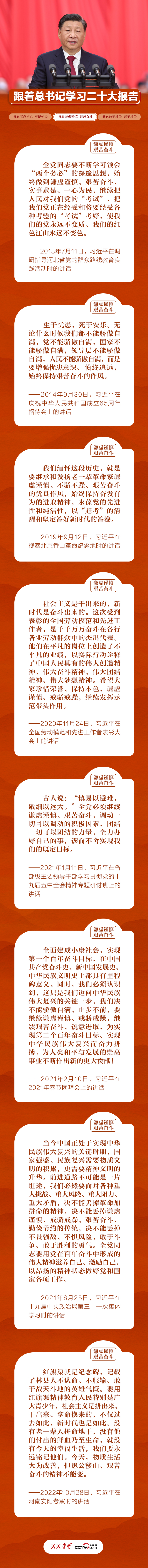 党的十八大以来,习近平总书记在不同场合多次强调坚持“谦虚谨慎、艰苦奋斗”的重要性,我们一同学习,从中感悟新征程上中国共产党人昂扬奋进的精神。