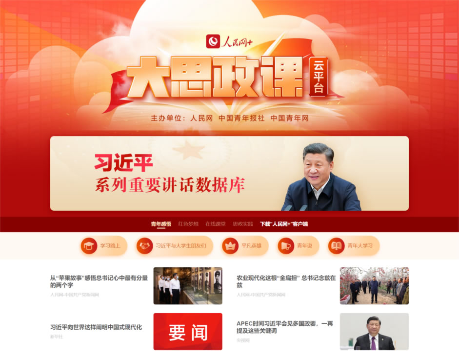 人民网“大思政课”云平台是人民网整合自身思政领域资源,集纳全网优质思政教育内容,面向全国青少年群体打造的思政工作平台,设置习近平系列重要讲话数据库、青年感悟、红色梦想、在线课堂、思政实践等板块,涵盖线上与线下、理论与实践、展览与培训等多形态的内容、产品与服务。云平台以“人民网+”客户端为主阵地,并可灵活嵌入各类智能终端,实现最广泛触达青少年群体。