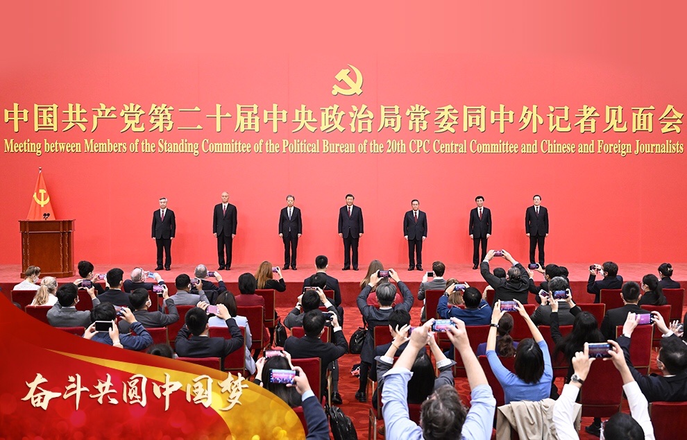2022年10月23日,习近平等二十届中共中央政治局常委同中外记者见面。