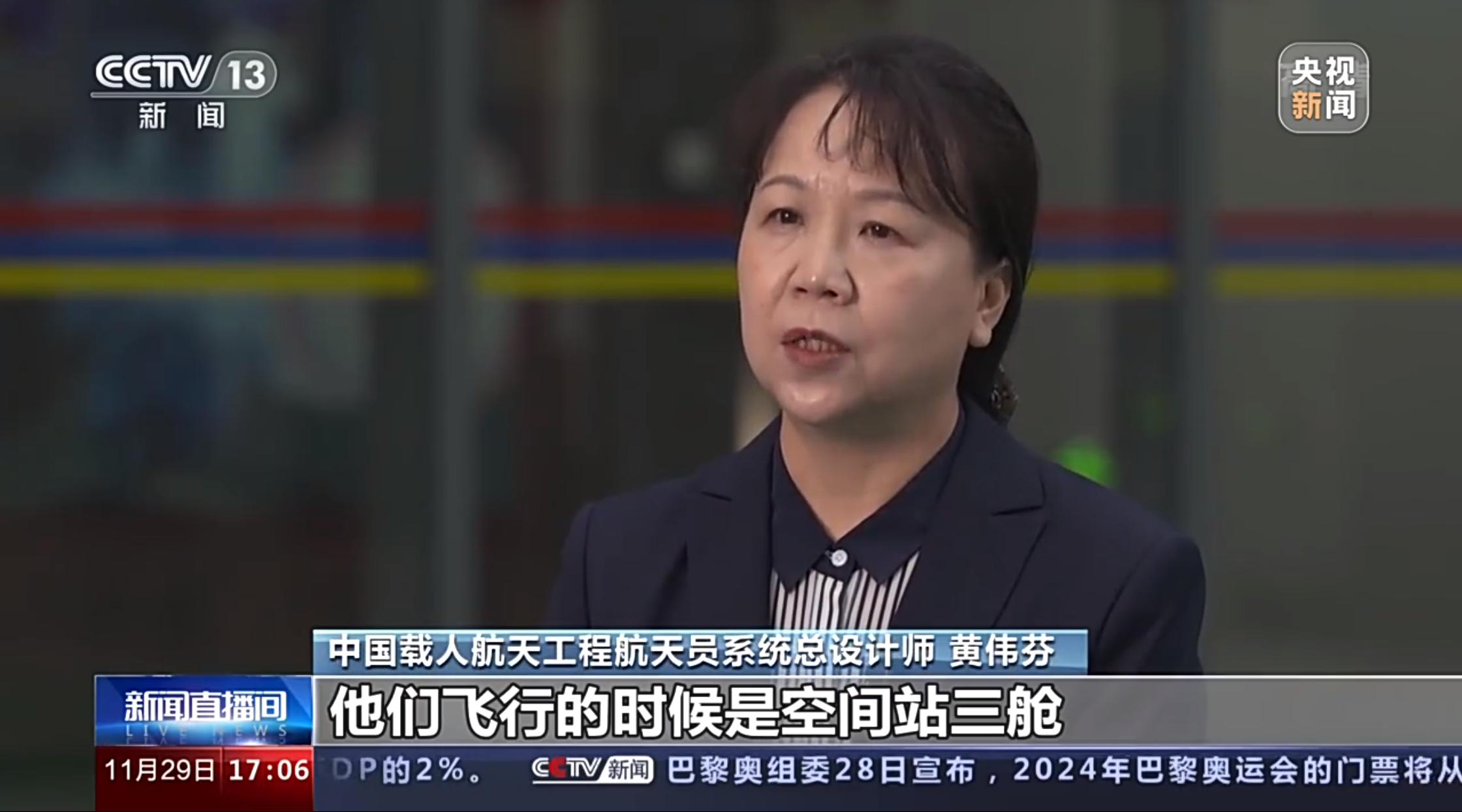 中国载人航天工程航天员系统总设计师 黄伟芬:他们飞行的时候是空间站三舱整体构型最大的时候,三个舱段,对航天器运行的管理、维护的管理,工作量本身就是巨大的,比单舱和两舱的时候要更大。