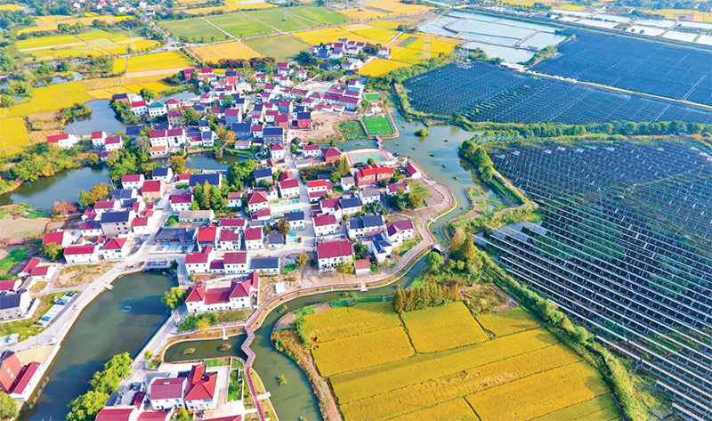 近年来,浙江省湖州市长兴县因地制宜开展“光伏+渔业”的光伏发电项目,助力乡村振兴、农民增收。图为2022年10月31日航拍下的长兴县吕山乡雁陶村,金色稻田与民居、光伏、河道相映成景,宛如一幅美丽画卷。 人民图片 陈海伟/摄