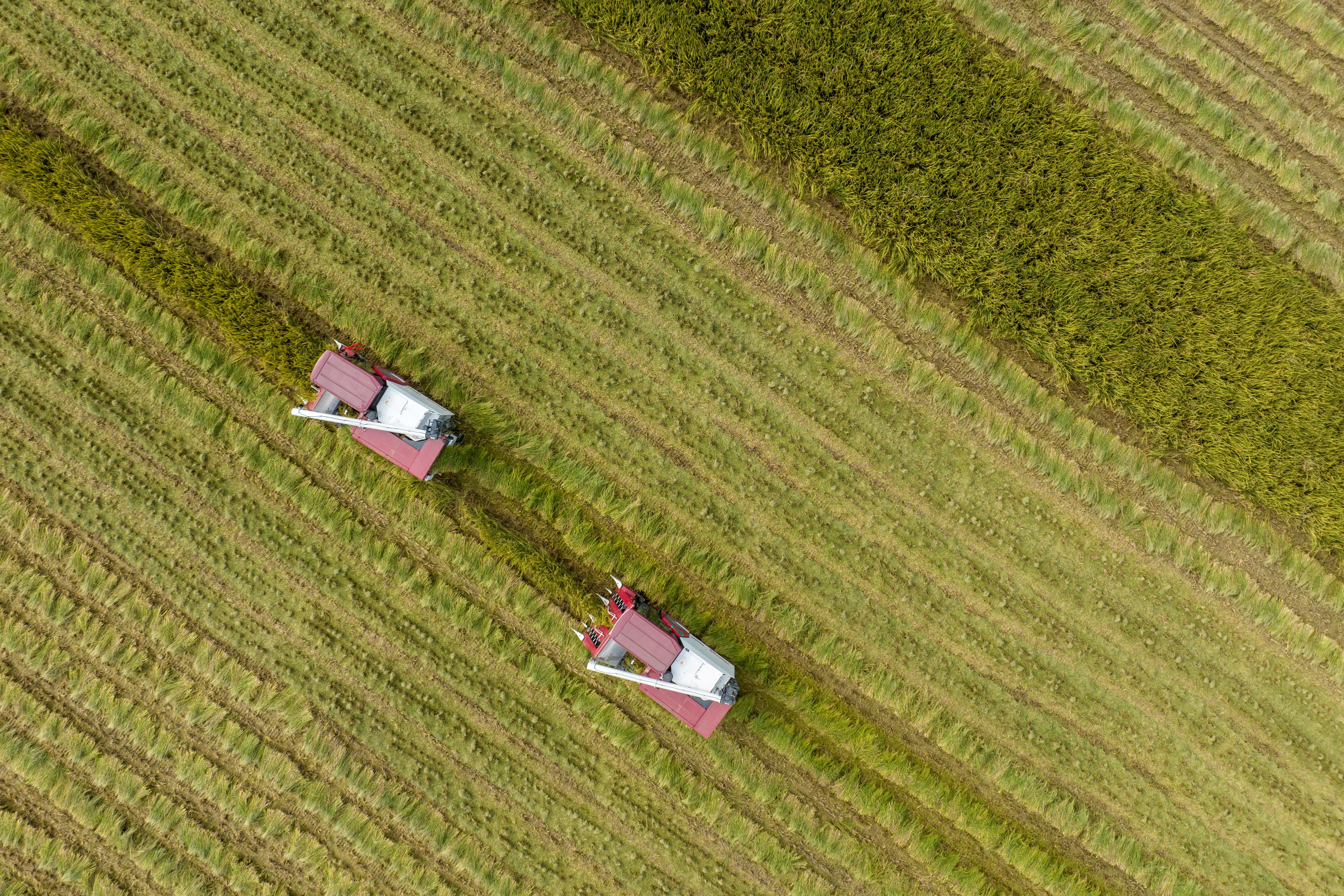 △2022年8月15日,四川眉山,收割机在太和镇永丰村稻田收割水稻。