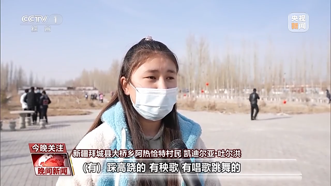 新疆拜城县大桥乡阿热恰特村民 凯迪尔亚•吐尔洪:有踩高跷的、有秧歌、有唱歌跳舞的,我们大家聚在一起特别高兴,我们的生活水平也越来越好了。