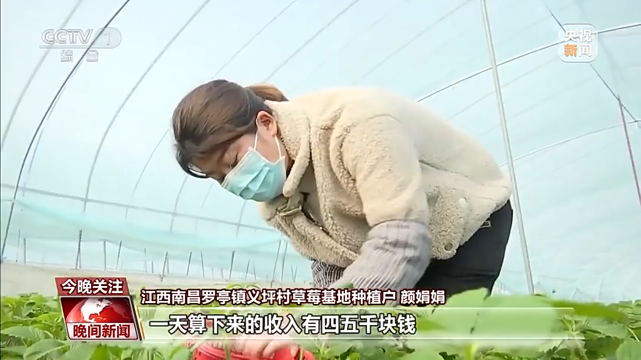 江西南昌罗亭镇义坪村草莓基地种植户 颜娟娟:一天有四五十个人来采摘,一天算下来的收入有四五千块钱,给我带来了不错的收益。