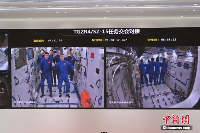 图为“胜利会师”的两个航天员乘组的太空合影。 汪江波 摄