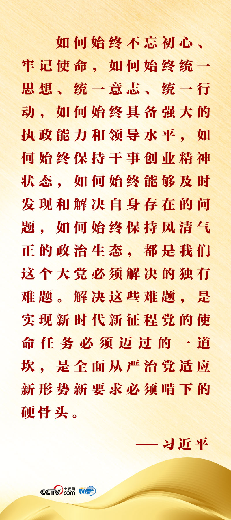 “要站在事关党长期执政、国家长治久安、人民幸福安康的高度,把全面从严治党作为党的长期战略、永恒课题,始终坚持问题导向,保持战略定力,发扬彻底的自我革命精神,永远吹冲锋号,把严的基调、严的措施、严的氛围长期坚持下去,把党的伟大自我革命进行到底。”