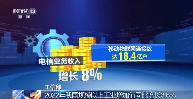 在国新办昨天(18日)举行的新闻发布会上,工信部发言人介绍了2022年工业和信息化发展情况。2022年,我国规模以上工业增加值同比增长3.6%;高技术制造业增加值同比增长7.4%,高于制造业增加值增速4.4个百分点;电信业务收入增长8%,移动物联网连接数达18.4亿户。