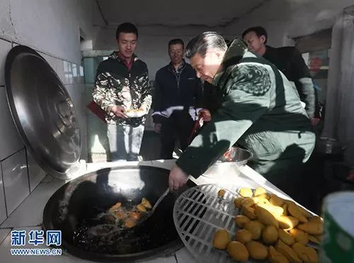 2017年1月24日,习近平在河北省张北县小二台镇德胜村村民徐学海家炸年糕。(图源:新华社)