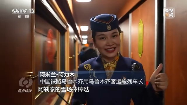 乘务员阿依江是阿勒泰人,每次值乘,她都会把家乡各个雪场的不同特点向旅客介绍一番。
