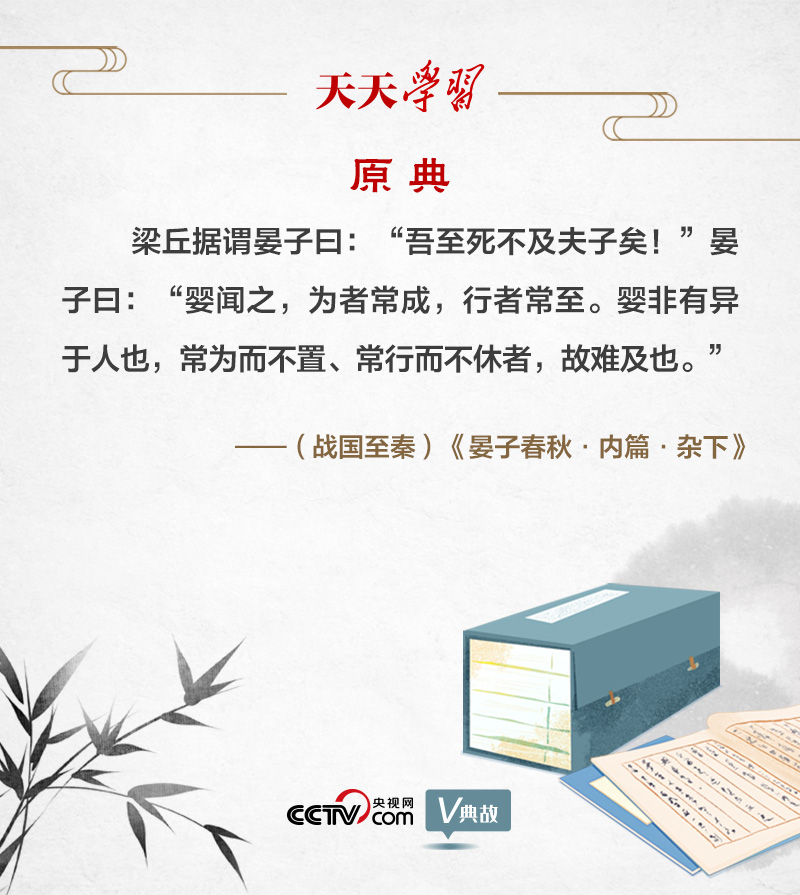 “为者常成,行者常至”,出自春秋时期齐相晏子与大夫梁丘据的一段对话。梁丘据与晏子既是朋友,也是政治对手。一次,他对晏子说:“我恐怕到死也赶不上先生您了!”晏子说:“我听说,努力去做的人通常可以成功,不倦前行的人常常可以到达目的地。我和别人比并没有什么不同,只是经常做个不停、走个不停罢了,所以很难被赶上。”