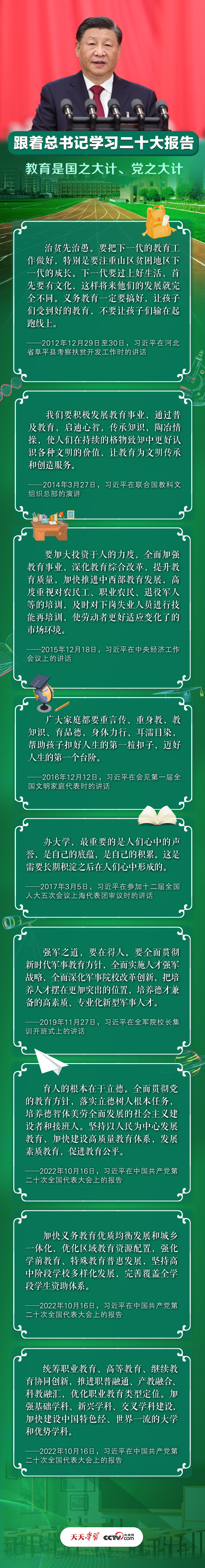 党的十八大以来,以习近平同志为核心的党中央高度重视教育事业,对教育工作作出了一系列重要部署和重要决策,推动教育事业取得历史性成就。习近平总书记曾在不同场合对义务教育、高等教育、家庭教育、职业教育等多方面作出重要论述。央视网《天天学习》特推出长图解,与您一同学习领会总书记的教育观。