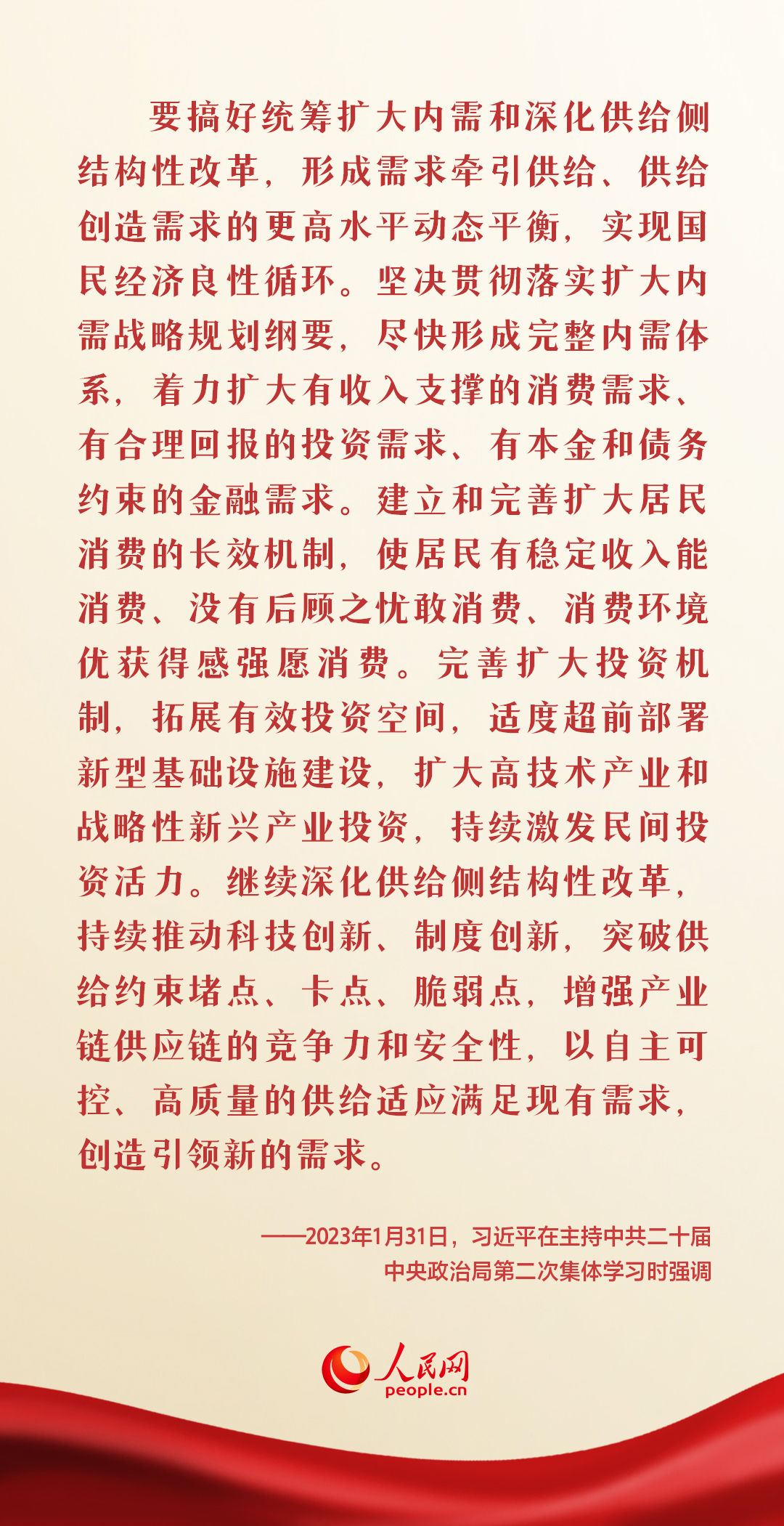2023年经济发展如何坚定信心开新局、启新程?人民网梳理习近平总书记相关讲话内容并邀请专家解读,本篇聚焦“着力扩大国内需求”。