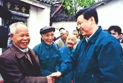 △1999年11月,时任福建省委副书记、代省长的习近平在永定暴动旧址——金谷寺前慰问“五老”人员代表。