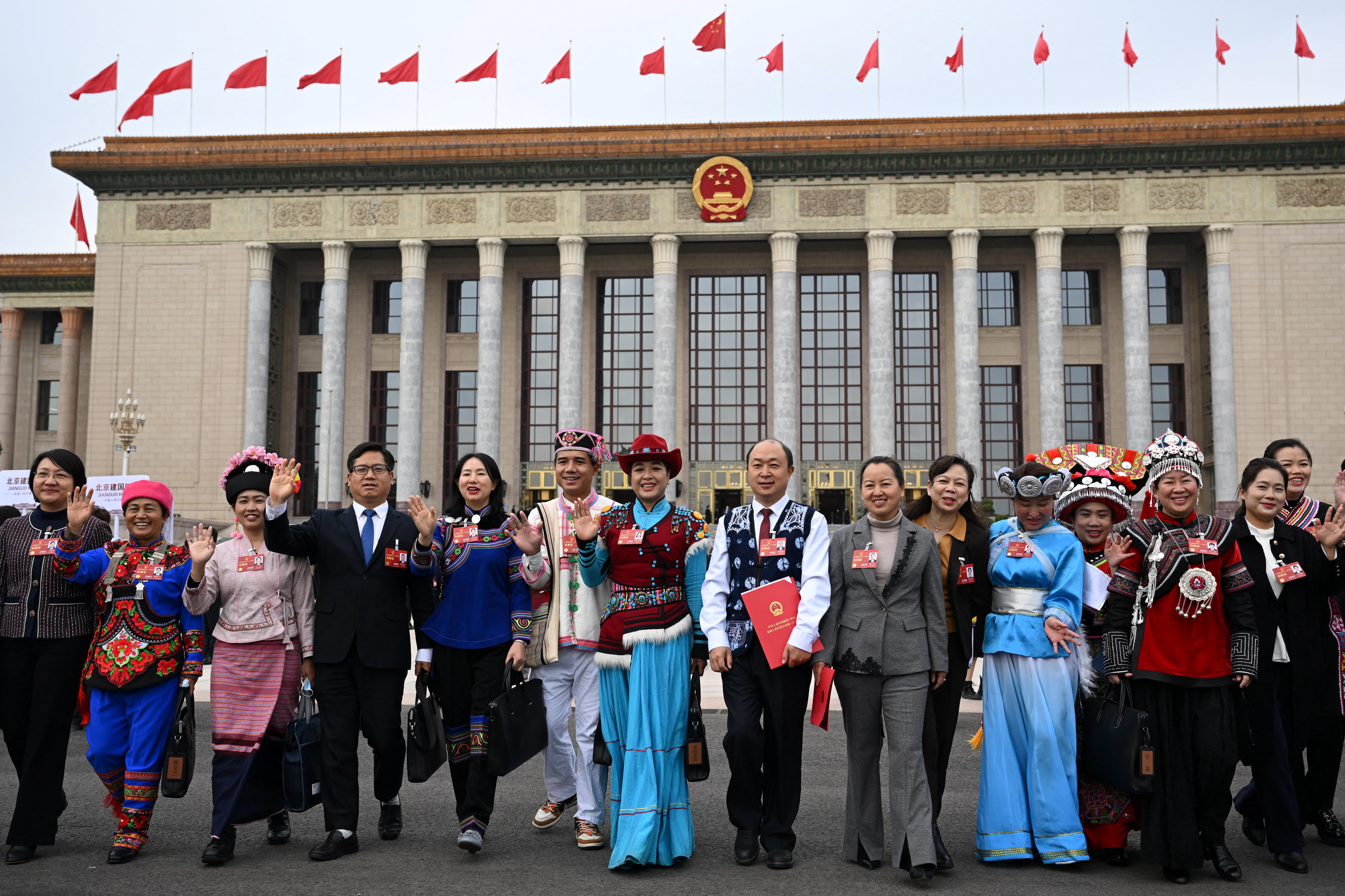 △2023年3月13日,第十四届全国人民代表大会第一次会议在北京人民大会堂闭幕。这是会后,代表走出人民大会堂。