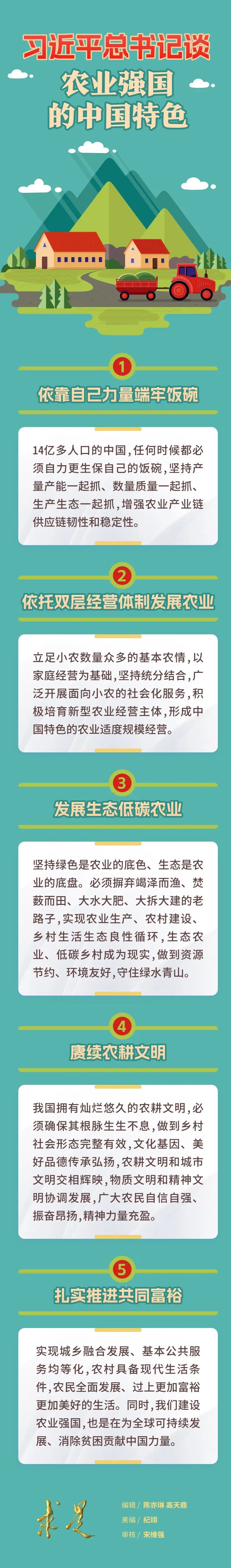 所谓共同特征,就是要遵循农业现代化一般规律,建设供给保障强、科技装备强、经营体系强、产业韧性强、竞争能力强的农业强国。所谓中国特色,就是立足我国国情,立足人多地少的资源禀赋、农耕文明的历史底蕴、人与自然和谐共生的时代要求,走自己的路,不简单照搬国外现代化农业强国模式。