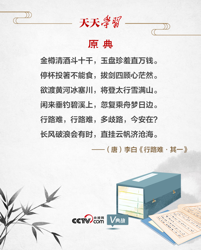 “行路难”为乐府古题,多咏叹世路艰难及贫困孤苦的处境。李白的《行路难》共三首,“长风破浪会有时”出自第一首。唐天宝元年(742年),李白奉诏入京,担任翰林供奉。后因权臣谗毁排挤,被“赐金放还”。《行路难》便是李白离开长安时所作。