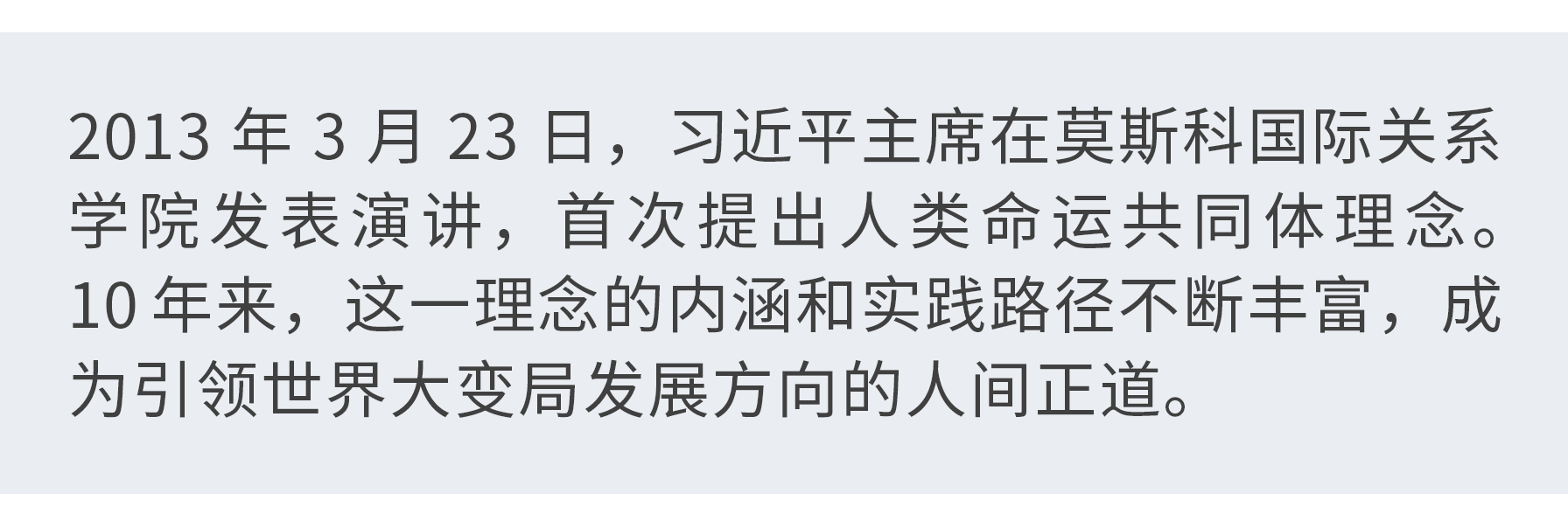 10年来,习近平主席以深邃的历史眼光和博大的天下情怀,相继提出共建“一带一路”倡议、全球发展倡议、全球安全倡议、全球文明倡议,丰富了人类命运共同体理念的内涵和实践路径,为应对世界之变、时代之变、历史之变提供了中国方案。
