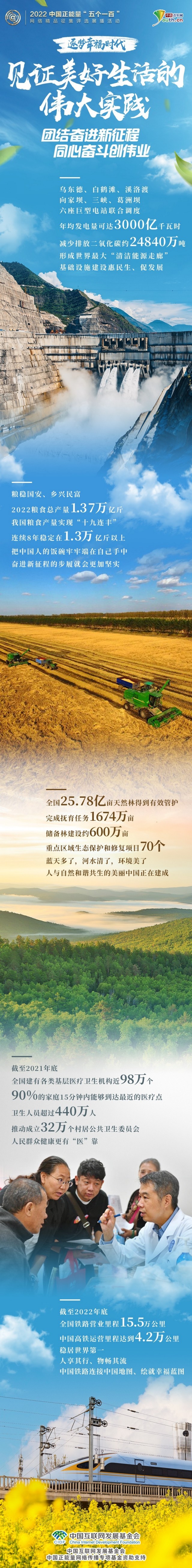 粮食生产实现“十九连丰”、生态文明建设深入人心、基层医疗卫生机构全覆盖、基础设施建设加码发力、综合立体交通网加速成形……“五个一百”展示助推中国经济发展、服务百姓生活的重大项目与惠民工程,用人们创造美好生活的伟大实践,汇聚同心奋斗的磅礴力量,激励亿万网民逐梦幸福时代。(记者 刘尚君 潘晓文 朱钧有)