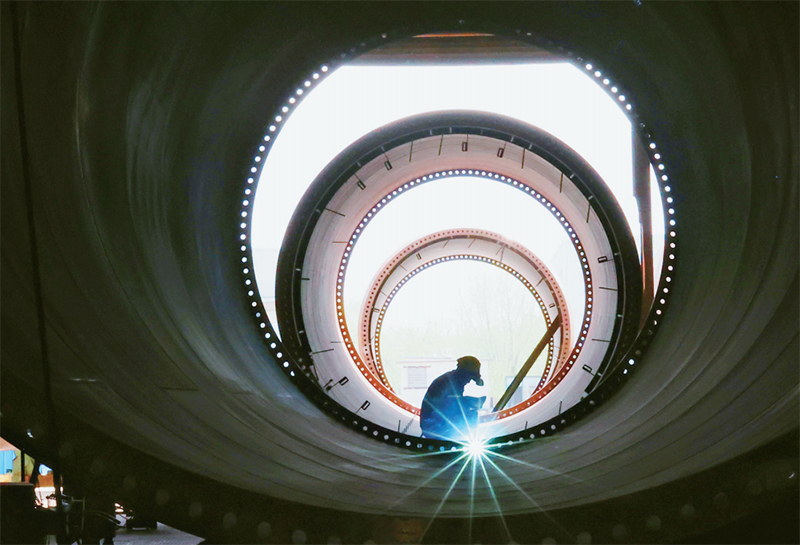 2023年一季度,我国国内生产总值同比增长4.5%,国民经济开局良好,为实现全年发展目标奠定了基础,注入了信心。图为2023年4月18日,工人在江苏连云港经济技术开发区一家公司内加工组装风电塔筒。 中新社发 耿玉和/摄