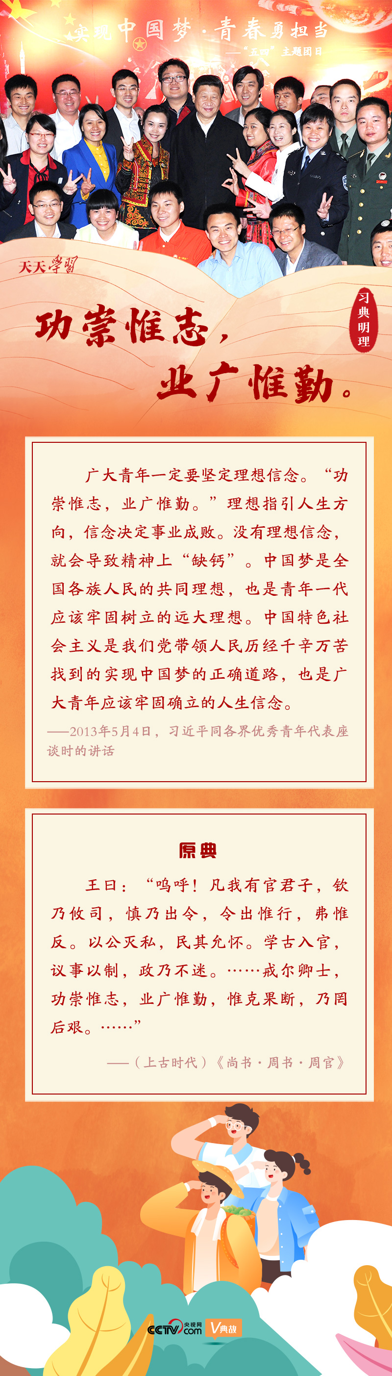 青年最富有朝气、最富有梦想,是国家和民族的希望。青年兴则国家兴,青年强则国家强。2013年5月4日,习近平总书记在同各界优秀青年代表座谈时,引用古语“功崇惟志,业广惟勤”,强调“广大青年一定要坚定理想信念”,指出中国梦是全国各族人民的共同理想,也是青年一代应该牢固树立的远大理想。中国特色社会主义是我们党带领人民历经千辛万苦找到的实现中国梦的正确道路,也是广大青年应该牢固确立的人生信念。