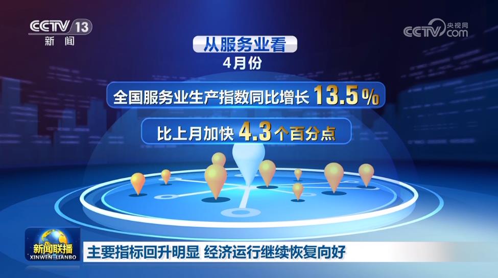从服务业看,4月份,全国服务业生产指数同比增长13.5%,比上月加快4.3个百分点。