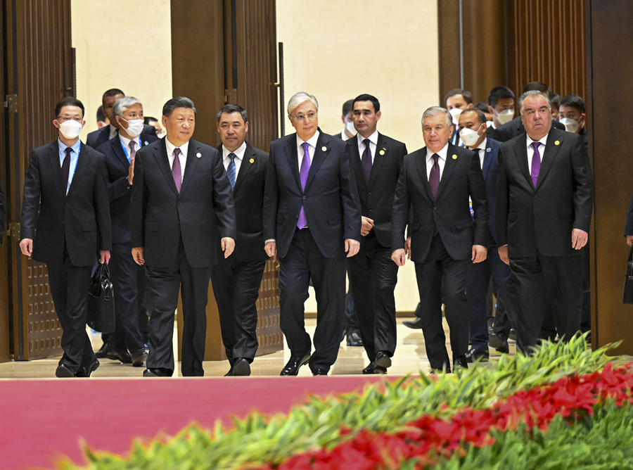 5月19日,中国-中亚峰会在西安国际会议中心成功举行,国家主席习近平同哈萨克斯坦总统托卡耶夫、吉尔吉斯斯坦总统扎帕罗夫、塔吉克斯坦总统拉赫蒙、土库曼斯坦总统别尔德穆哈梅多夫、乌兹别克斯坦总统米尔济约耶夫共同会见记者。这是习近平同中亚五国元首共同步入会场。